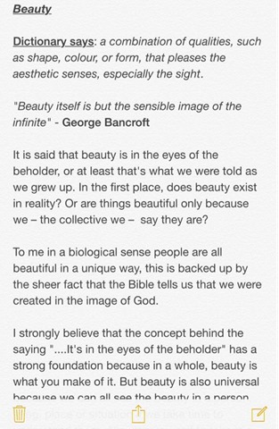 When I began writing this in my journal, I planned to write only from my personal experiences and what beauty meant to me. However, I decided to share this experience with others and ask people what beauty means to them as well. The reasons could have been long, short, spiritual, religious or inspired by anything. It could have even been selfies to express what beauty means to them. Below, I have included what people thought of what beauty means.